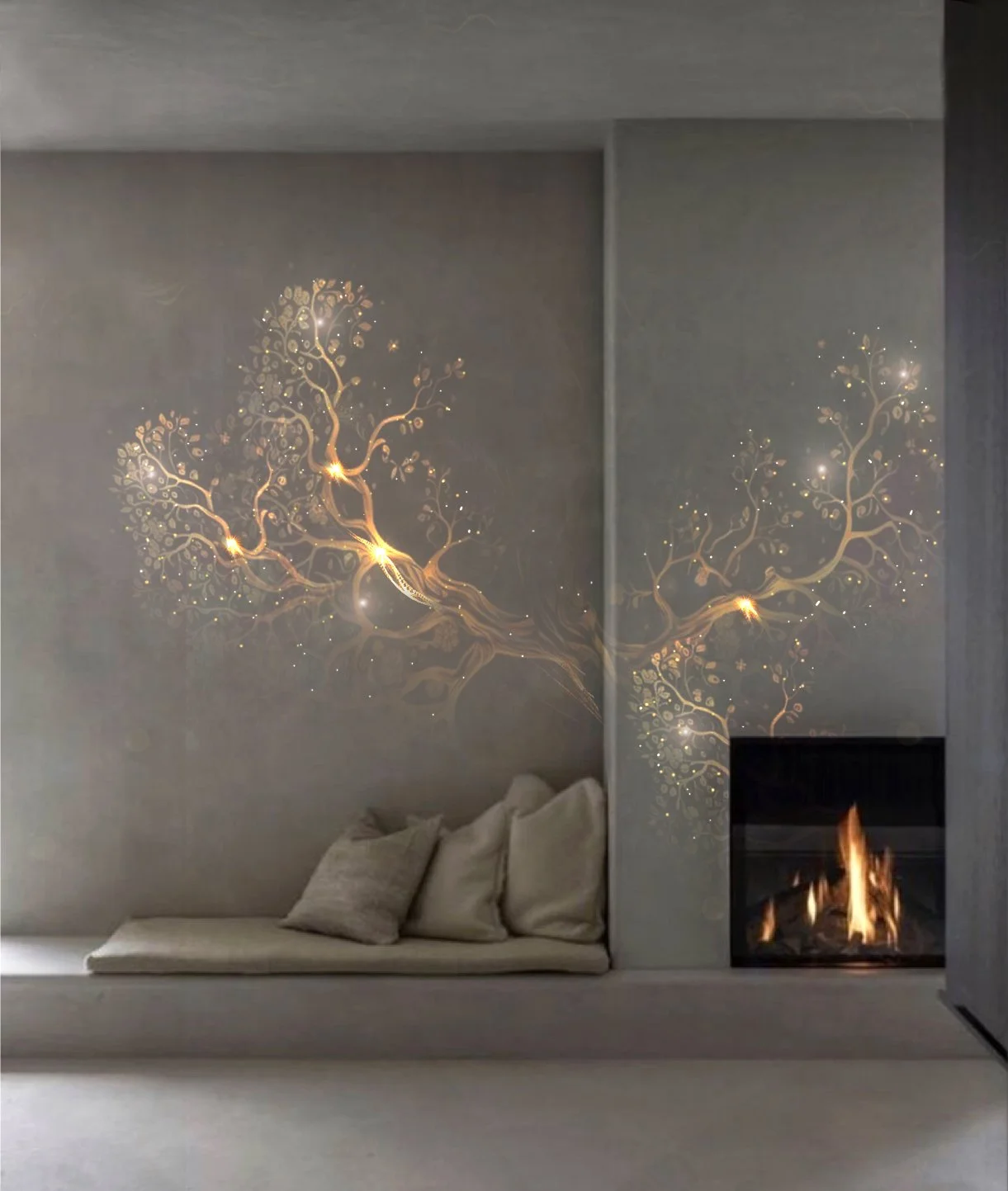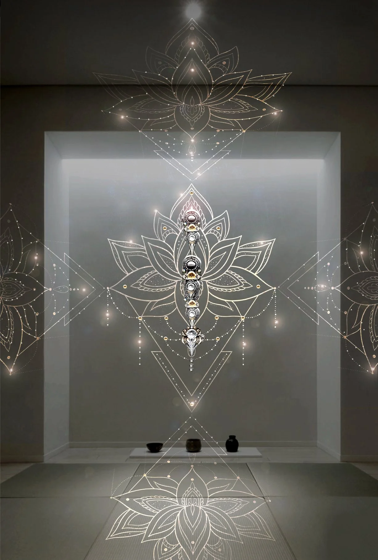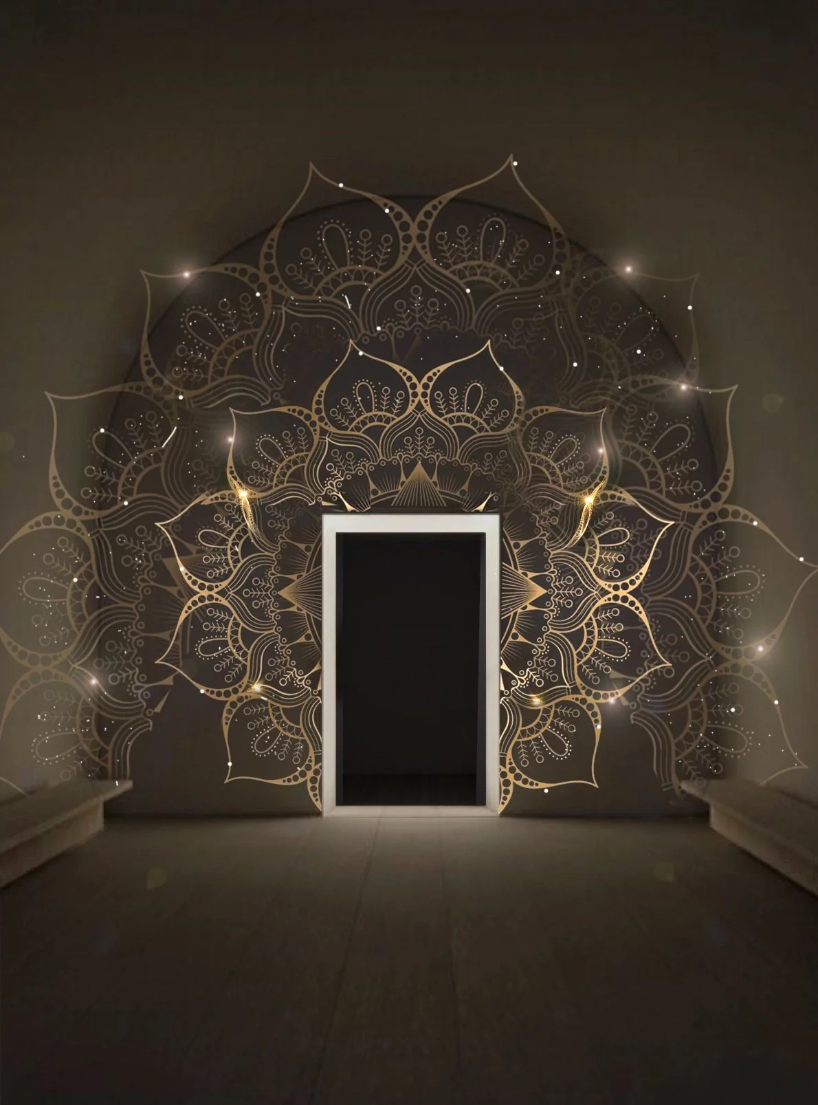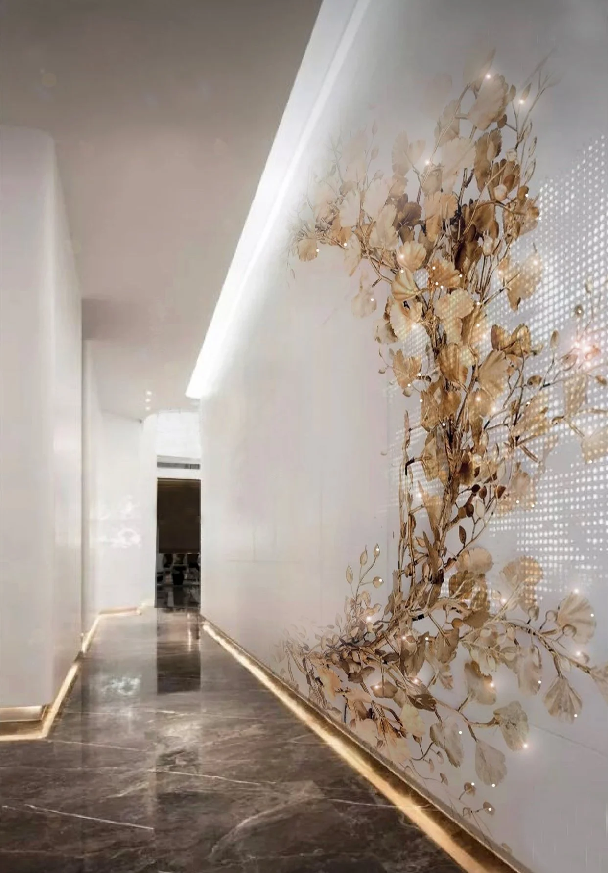 Gold leaves, Metallic Paint and Swarovski crystals on walls.