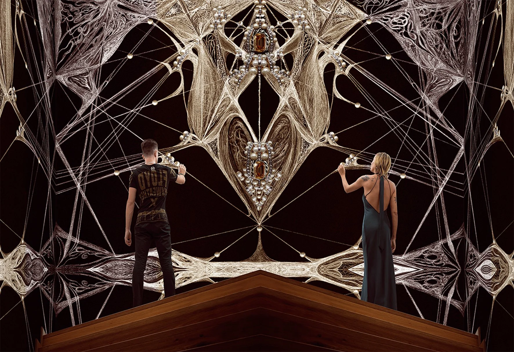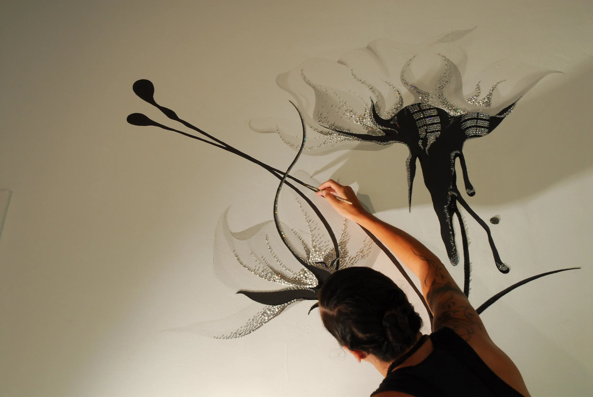 Acrylic paint and Swarovski crystals on wall .